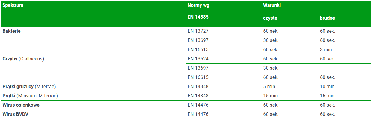 - Przeznaczone do dezynfekcji różnorodnych powierzchni sprzętu medycznego ze szkła, porcelany, metalu, gumy, tworzyw sztucznych oraz szkła akrylowego, foteli zabiegowych, sprzętu rehabilitacyjnego, inkubatorów