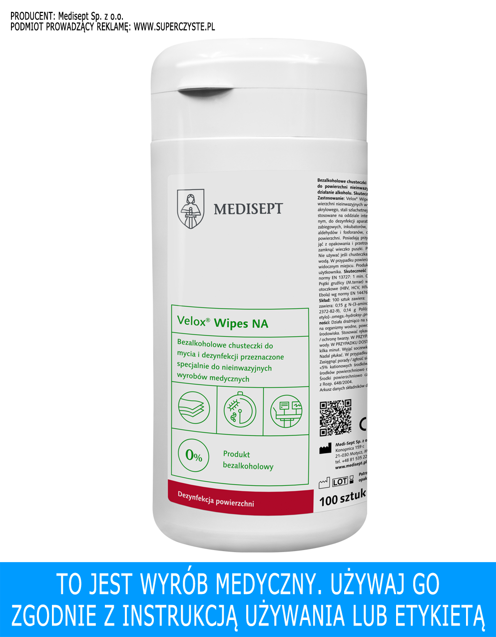 Velox Wipes NA są zalecane do dezynfekcji powierzchni nieinwazyjnych wyrobów medycznych z tworzyw