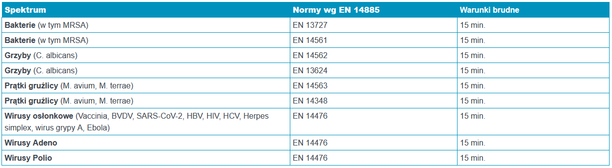 - Działa w 15 min. na bakterie, grzyby, prątki gruźlicy, wirusy otoczkowe, Adeno, Polio